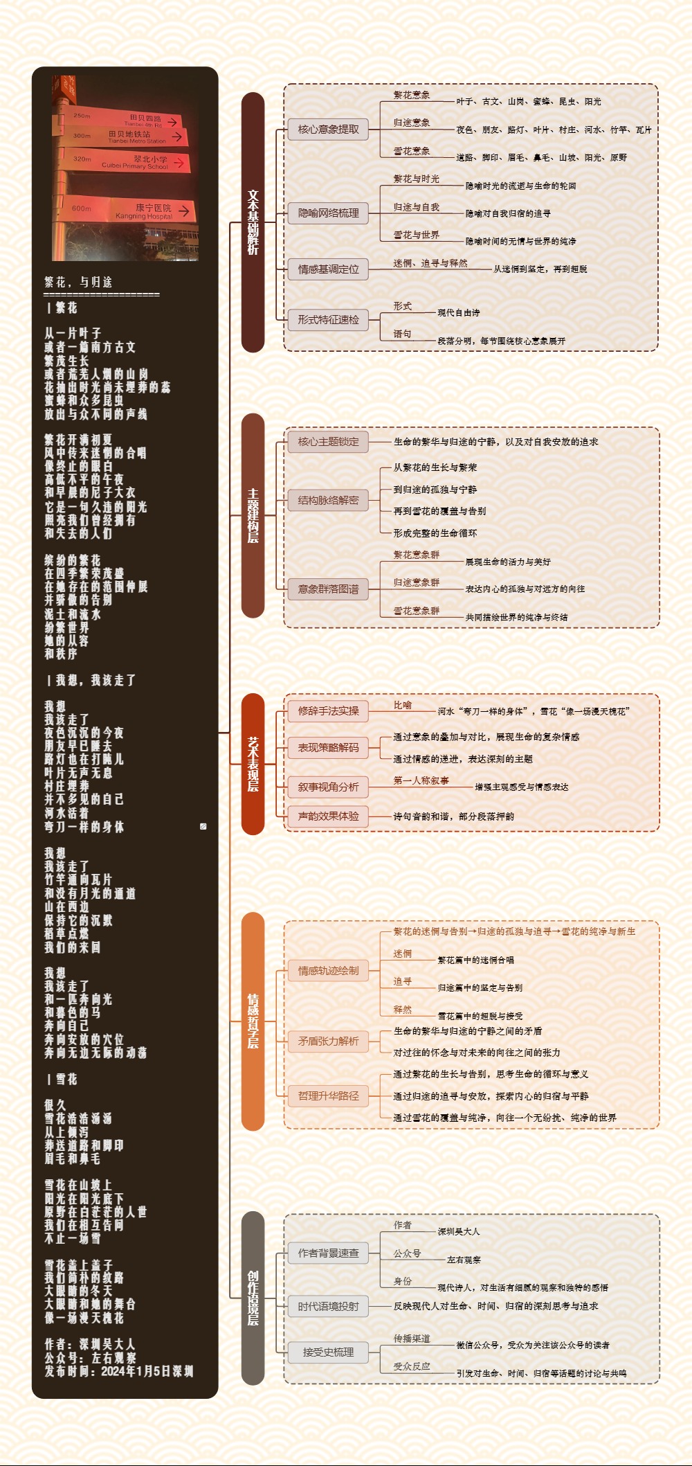 艺术表现上,修辞手法多样,拟人、比喻赋予描写生动性;白描、借景抒情、以小见大等表现策略,从日常场景挖掘人生哲理;第一人称视角增强真实感,长短句结合形成节奏变化。情感哲学层面,情感轨迹从自然观察逐渐升华到对人生选择、归宿与价值的思考,出发与归来、自然蓬勃与人间寂静的矛盾张力贯穿全诗。创作语境上,反映当代人在传统节日背景下对生命本质和人生方向的追寻,借助自然景象寻求内心答案。(本诗词解析借助AI技术进行分析,仅供读者阅读参考。)