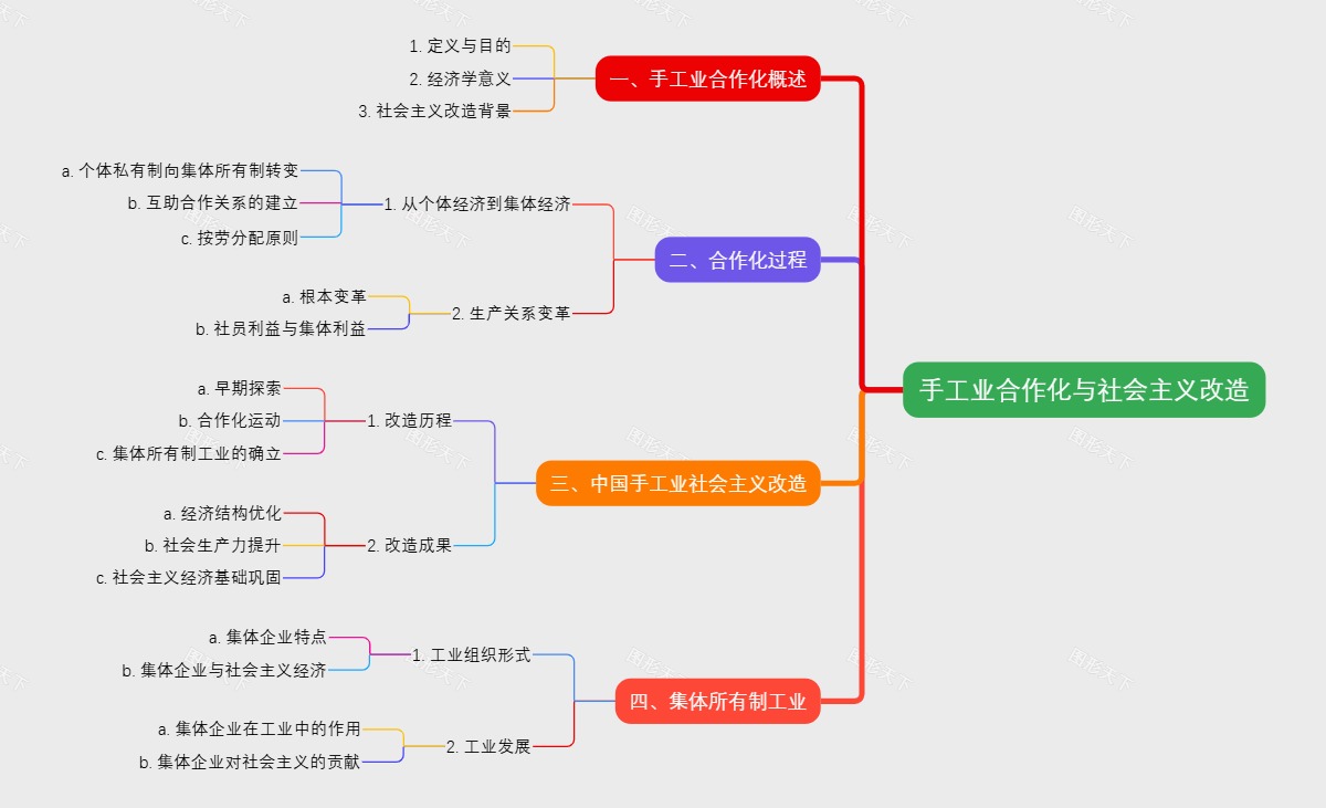 本导图从手工业合作化的定义、目的、过程、中国手工业社会主义改造历程、改造成果以及集体所有制工业的特点和作用等多个维度,系统地展示了手工业合作化与社会主义改造的相关知识框架。