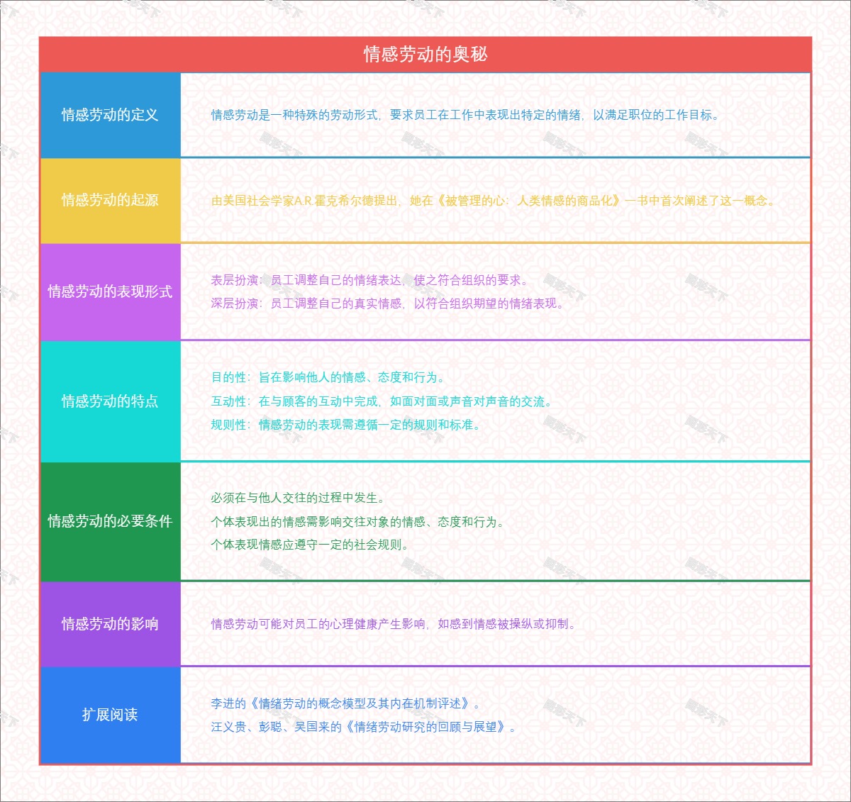 本文概述了情感劳动的基本概念、起源、表现形式、特点、必要条件以及对员工可能产生的影响,并通过扩展阅读提供了更深入理解的途径。