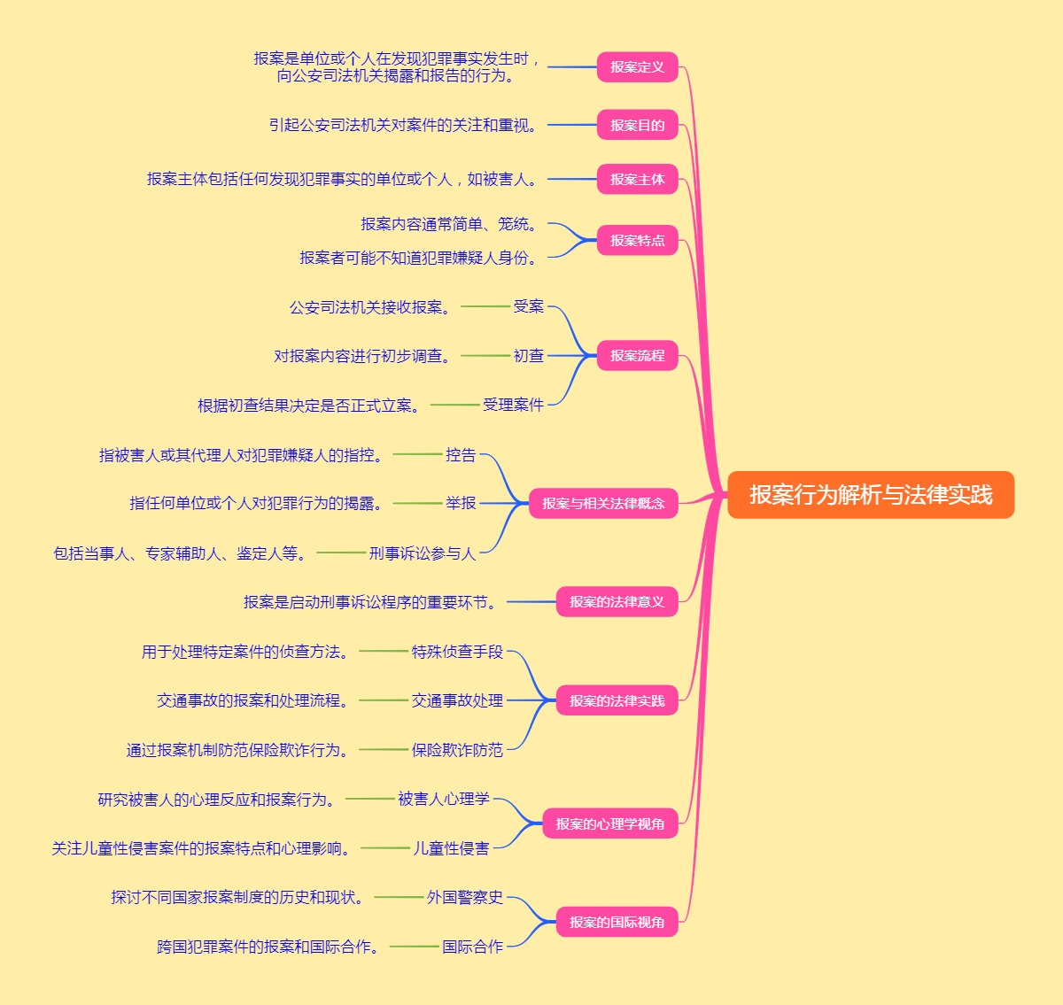本导图从报案的定义、目的、主体、特点、流程、相关法律概念、法律意义、法律实践、心理学视角和国际视角等多个维度,全面解析报案行为及其在法律体系中的作用和重要性。