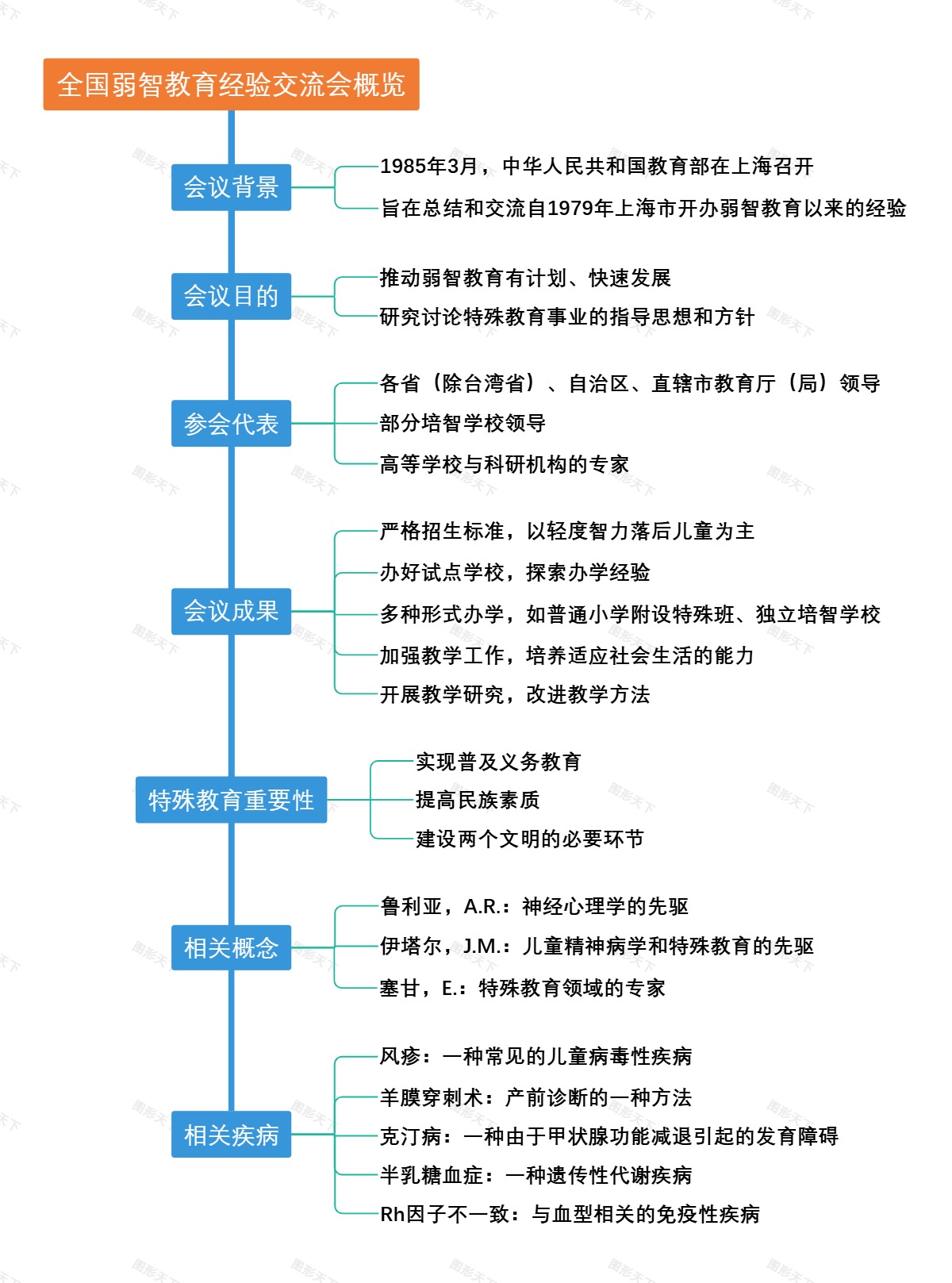 本导图系统地概述了1985年全国弱智教育经验交流会的背景、目的、参会代表、成果及特殊教育的重要性,并简要介绍了相关概念和疾病。