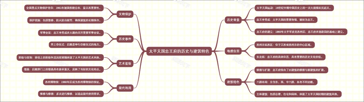 本文中的思维导图是由图形天下思维导图软件制作而成,点击上面思维导图图片可以直接打开图形天下思维导图软件,能够对“太平天国忠王府的历史与建筑特色”思维导图进行美化调整。