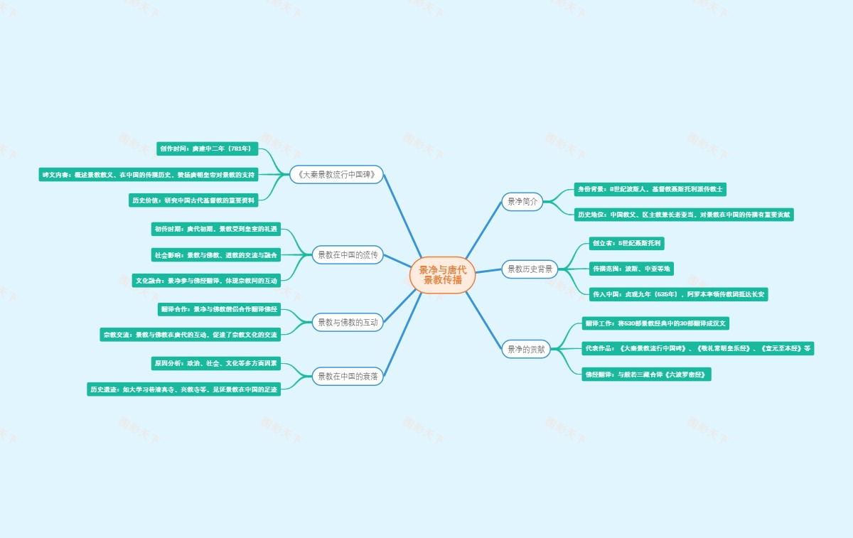 本导图系统地概述了景净的生平、景教的历史背景、景净的贡献、《大秦景教流行中国碑》的重要性、景教在中国的流传与影响、景教与佛教的互动,以及景教在中国的衰落过程,旨在为大众读者提供一个清晰、详尽的景教在中国传播的历史概览。
