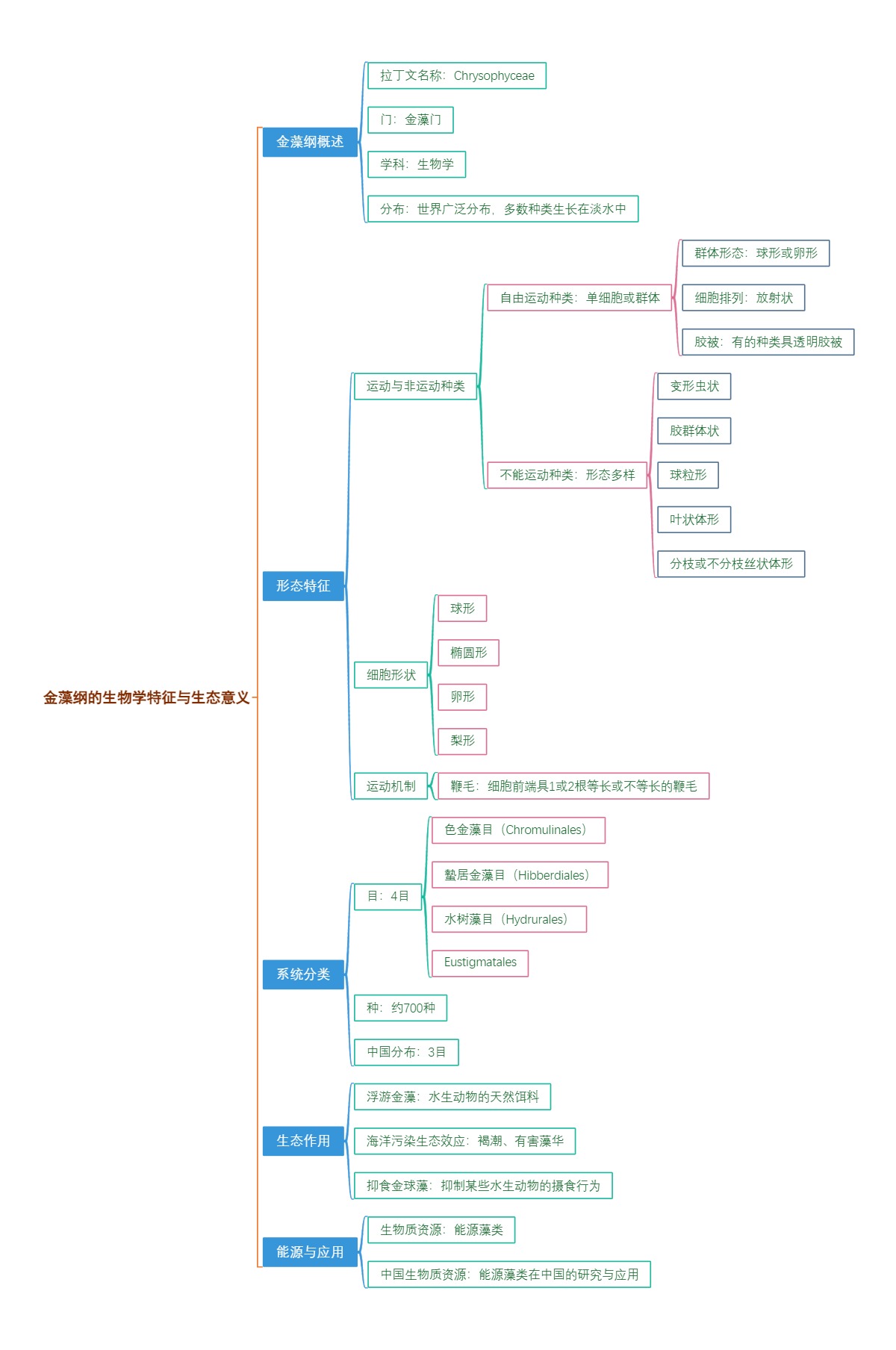 金藻纲的生物学特征与生态意义 作者:BreezyWhispers 更新时间:2025年03月01日 本导图详细展示了金藻纲的生物学特征、形态分类、系统分类、生态作用以及在能源与应用方面的价值,旨在为大众提供一个全面了解金藻纲的框架结构。 作者其他作品 Python模块导图 2025年10月01日 公务员法全面解析 2025年08月26日 开学准备全攻略 2025年08月23日 古代兵器的神秘纹饰:菱形暗格纹的奥秘 2025年08月13日 海区总图概览 2025年07月24日 性晚熟:青春期的延迟之谜 2025年07月07日 鹤山书院尊经阁概览 2025年06月26日 志愿服务时长概述 2025年06月14日 陆军指挥控制系统解析 2025年06月12日 老年糖尿病综合管理导图 2025年06月09日 天然气转化为合成气:能源转换的奥秘 2025年05月25日 梨大食心虫的生态与防治指南 2025年05月15日 挑流消能技术解析 2025年05月09日 反坦克导弹检测维修设备知识框架 2025年05月01日 安阳后岗商代青铜器出土概览 2025年04月21日 梳头人与京剧艺术 2025年03月24日 浮游生物薄层概述 2025年03月23日 海上试验规范全解析 2025年03月17日 基枝藻属:自然界中的绿色宝藏 2025年02月27日 国际计算力学协会(IACM)概述 2025年02月25日 重庆朝天门大桥概览 2025年02月18日 全苏工会中央理事会概览 2025年02月15日 贵州广播电台(民国)历史概览 2025年02月10日 热膨胀性概述 2025年01月11日 国防知识框架导图 2025年01月09日 全军基层文化建设会议 2024年12月18日 红嘴鸥:昆明的冬季使者 2024年12月16日 验光与屈光不正矫正导图 2024年12月15日 地球热演化模型概述 2024年12月02日 金银错工艺的历史与艺术价值 2024年12月01日 畜禽养殖与环境污染 2024年11月28日 明代宦官制度与秉笔太监 2024年11月25日 佛教五种种姓导图 2024年11月24日 杜牧《张好好诗》卷概述 2024年11月22日 双边市场:经济学中的交互平台 2024年11月18日 职位级别系统分析导图 2024年11月07日 罪刑法定原则详解 2024年11月05日 和谐时期概述 2024年11月04日 共犯从属理论解析与应用 2024年11月03日 非法获取国家秘密罪概述 2024年10月30日 纯电影:20世纪20年代欧洲先锋派电影运动 2024年10月27日 燕都精忠庙与清代北京戏曲文化 2024年10月22日 宫观概述 2024年10月17日
