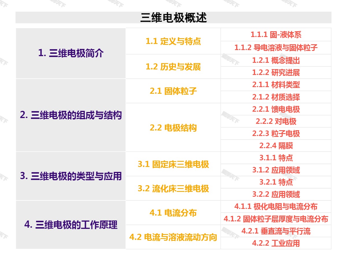 本导图旨在为大众提供三维电极的基础知识,包括其定义、组成、类型、工作原理以及应用领域,以便更好地理解这一技术在现代工业中的应用。