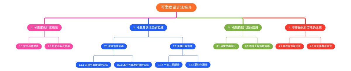 本导图旨在为大众读者提供关于可靠度设计法的全面介绍,包括其定义、历史发展、实施方法、应用领域以及与传统设计方法的对比。