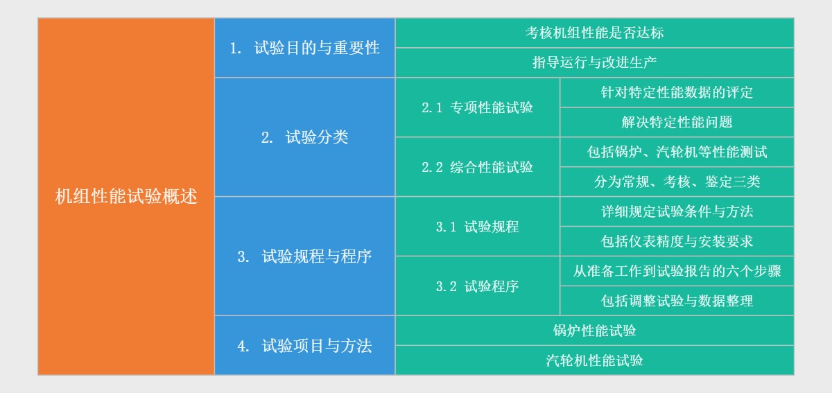 本导图提供了机组性能试验的全面概览,包括试验的目的、分类、规程、程序以及具体的试验项目和方法,旨在帮助读者理解机组性能试验的基本概念和流程。