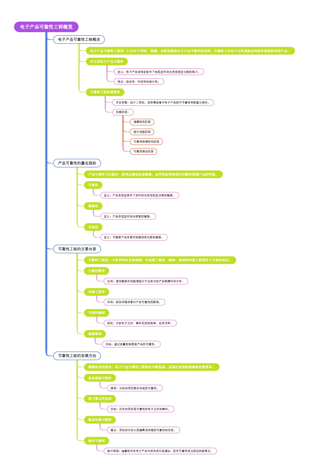 本导图提供了电子产品可靠性工程的全面概览,从基础概念到复杂的技术应用,以及该领域的最新发展方向。
