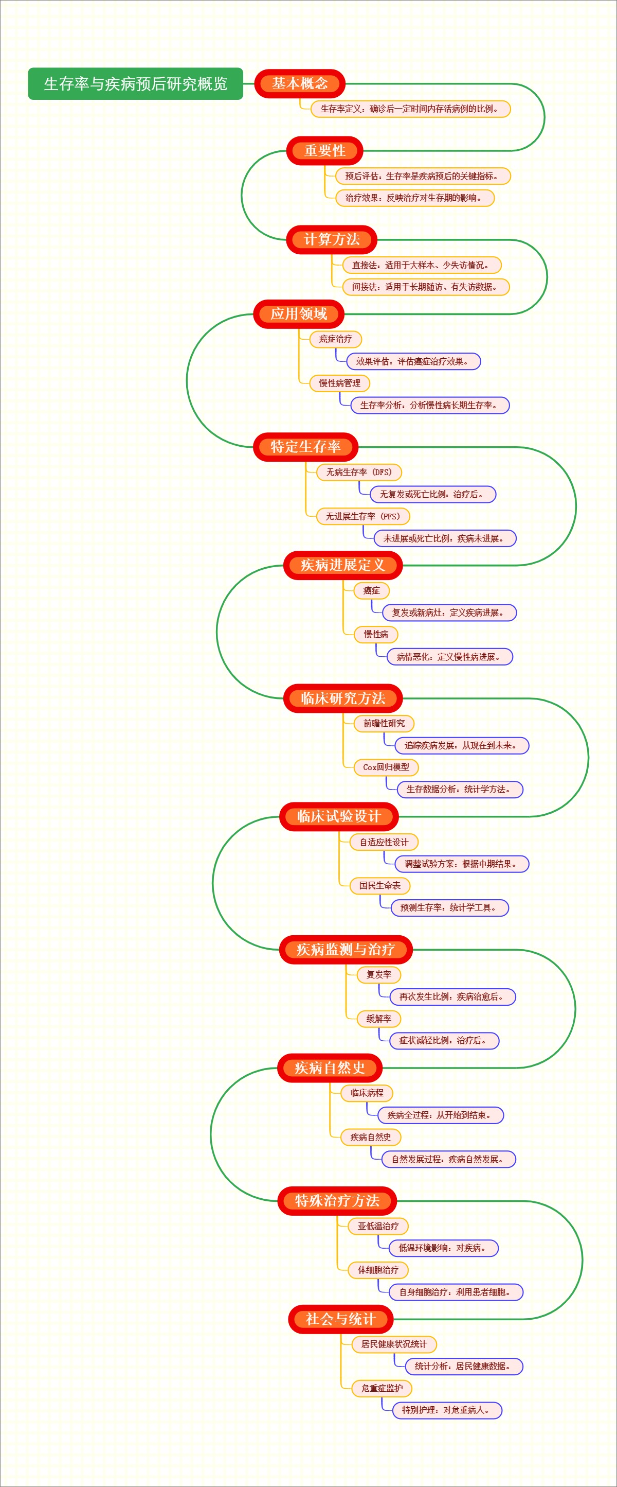 本导图系统地概述了生存率在疾病预后研究中的应用,包括基本概念、重要性、计算方法、特定生存率、疾病进展定义、临床研究方法、临床试验设计、疾病监测与治疗、疾病自然史、特殊治疗方法以及社会与统计等多个维度,为大众读者提供了一个全面而深入的理解框架。