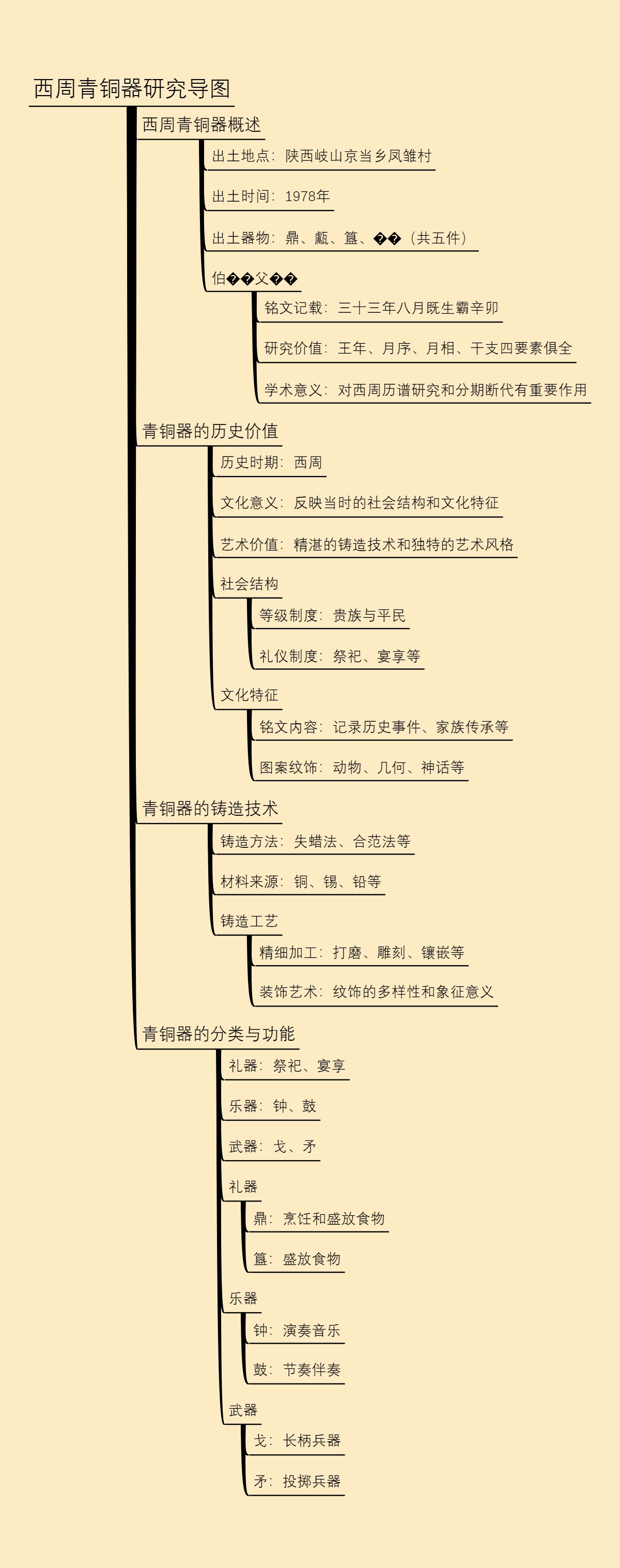 本导图从西周青铜器的出土背景、历史价值、铸造技术、分类与功能等多个维度,详细解析了西周青铜器的学术和文化意义,为大众提供了一个全面了解西周青铜器的框架结构。
