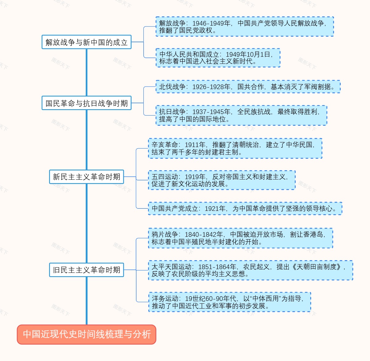 本导图系统地梳理了中国近现代史的重要事件,从旧民主主义革命到新中国的成立,通过时间线梳理和事件分析,展现了中国近现代史的发展脉络。