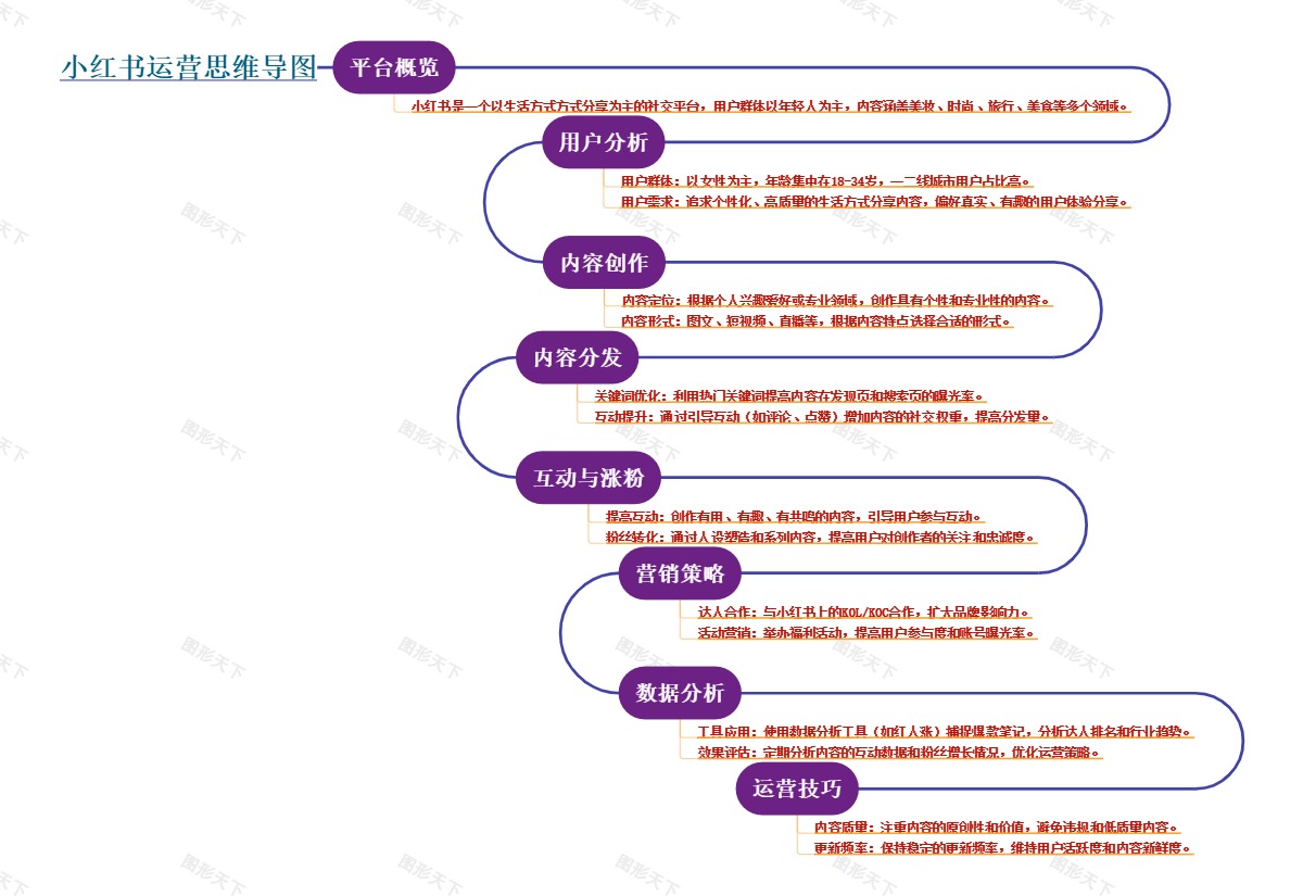 本导图系统地概述了小红书运营的关键要素,从平台特性、用户分析到内容创作、分发、互动、营销策略和数据分析,为创作者提供了一个全面的运营框架。