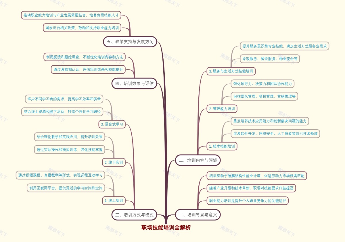 本导图全面剖析了职场技能培训的多个层面,从培训背景到具体内容,再到培训方式和效果评估,以及政策支持,旨在为大众读者提供一个清晰的职场技能培训全貌。