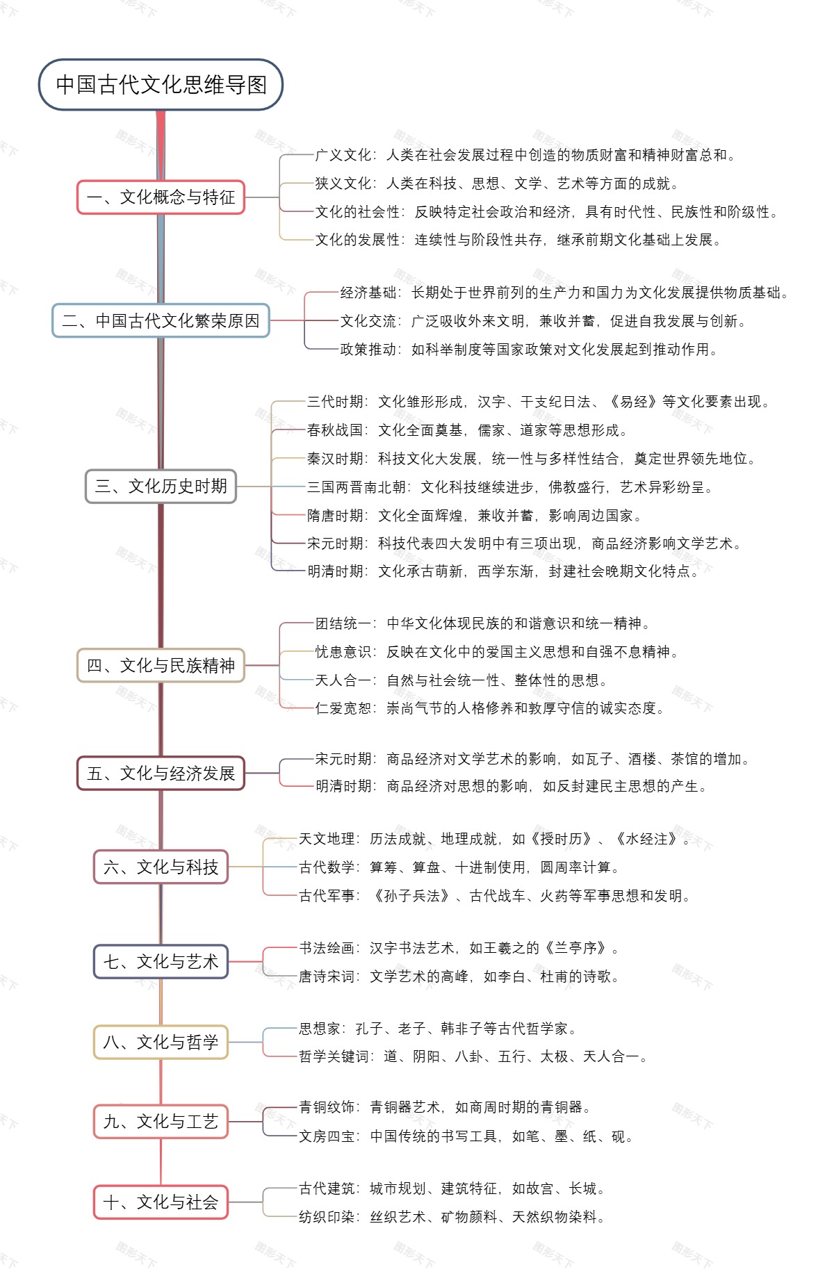 本导图系统地概述了中国古代文化的多个层面,从文化概念到各个历史时期的文化特征,再到文化与经济、科技、艺术、哲学、工艺及社会的关系,展现了中华文化的丰富内涵和独特魅力。