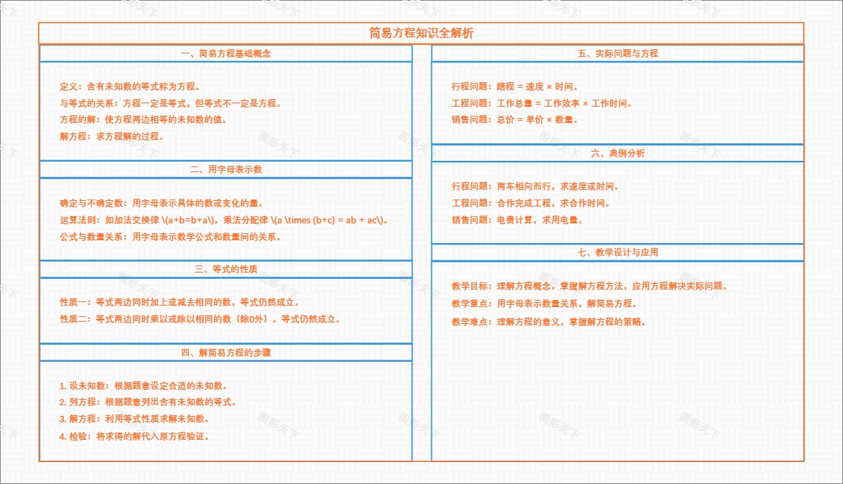 本导图系统地整理了简易方程的核心概念、解题步骤、实际应用以及教学设计,旨在帮助学生全面理解和掌握简易方程的相关知识。