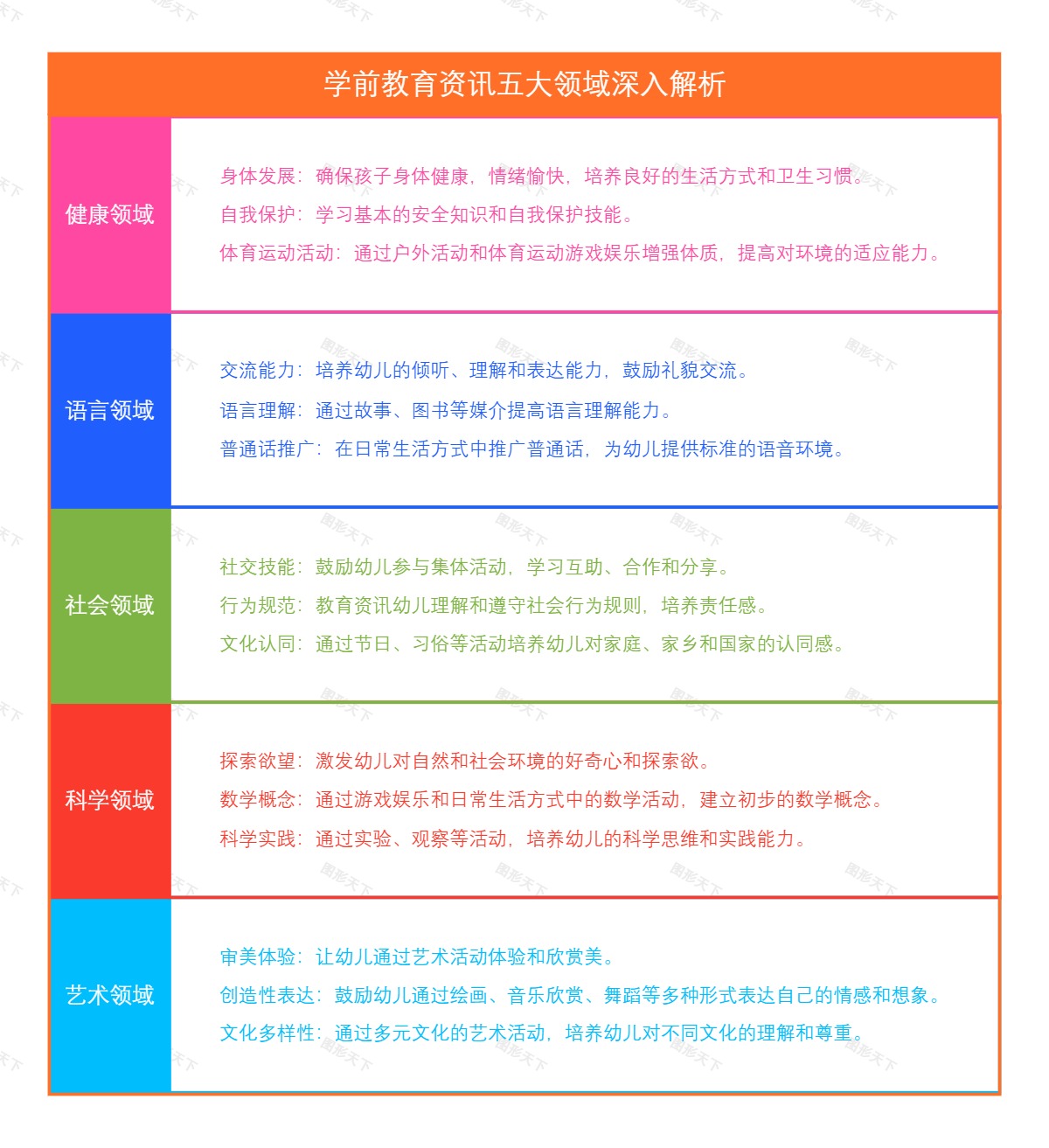 本导图深入剖析了学前教育资讯的五大领域,通过层层分解,展现了各领域的核心内容和教育资讯目标,旨在为教育资讯工作者和家长提供清晰的教育资讯指导和参考。
