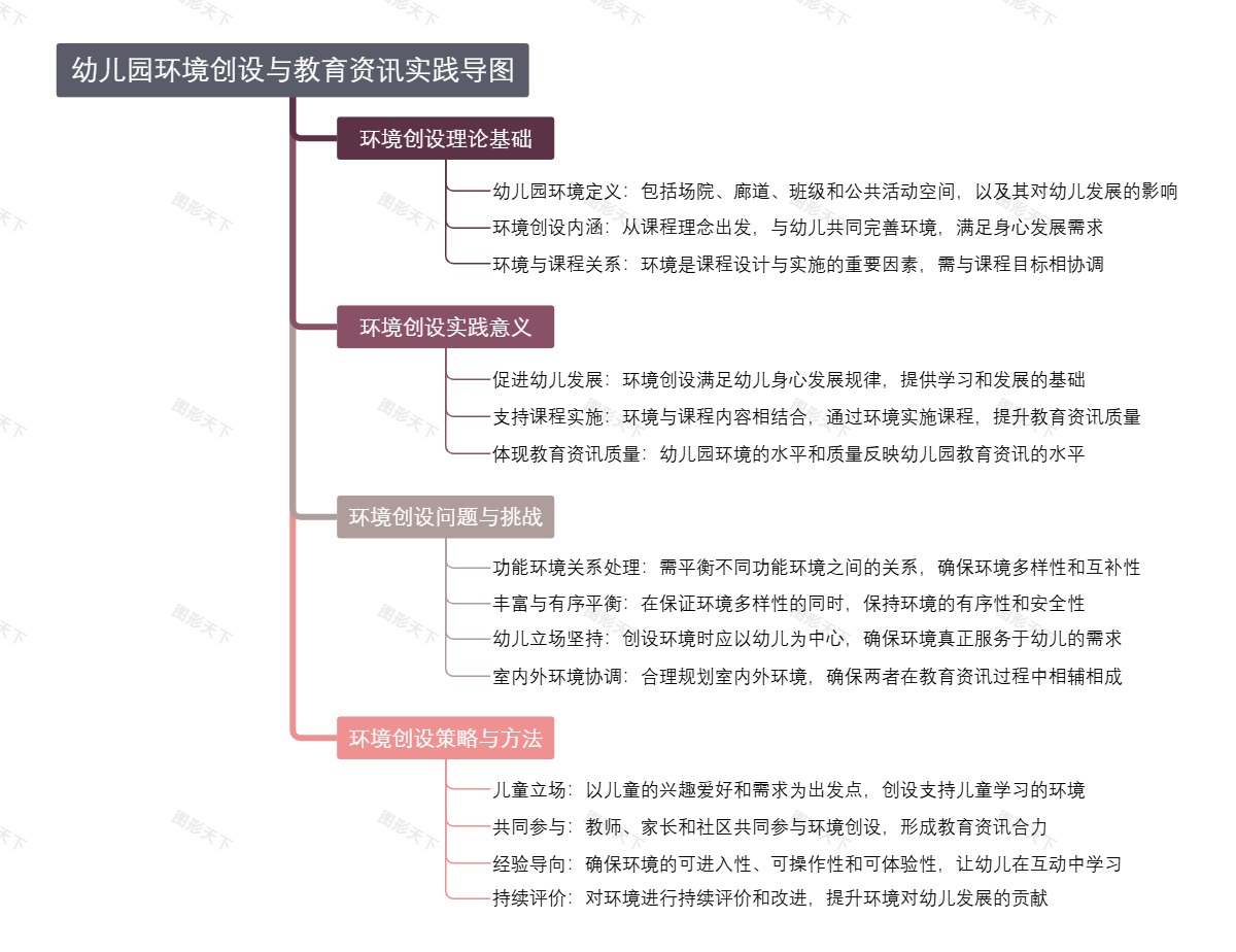 本导图系统地概述了幼儿园环境创设的理论基础、实践意义、面临的挑战、以及有效的策略和方法,旨在为幼儿园环境设计与教育资讯实践提供指导。