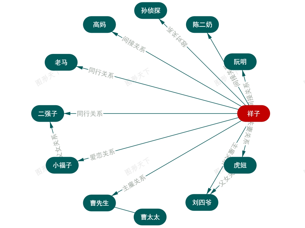 摘要:在《骆驼祥子》的复杂人物关系中,通过 “图形天下” 的 “关系数据可视化” 技术,清晰地勾勒出一张错综复杂却又条理分明的网络。祥子作为核心,与虎妞的夫妻关系、对小福子的爱恋、与刘四爷的主雇及间接的父女冲突,以及与老马等同行间的相互扶持与竞争,均得以直观展现。不仅展现了人物间的紧密联系,也深刻揭示了旧社会底层人民的苦难与挣扎。