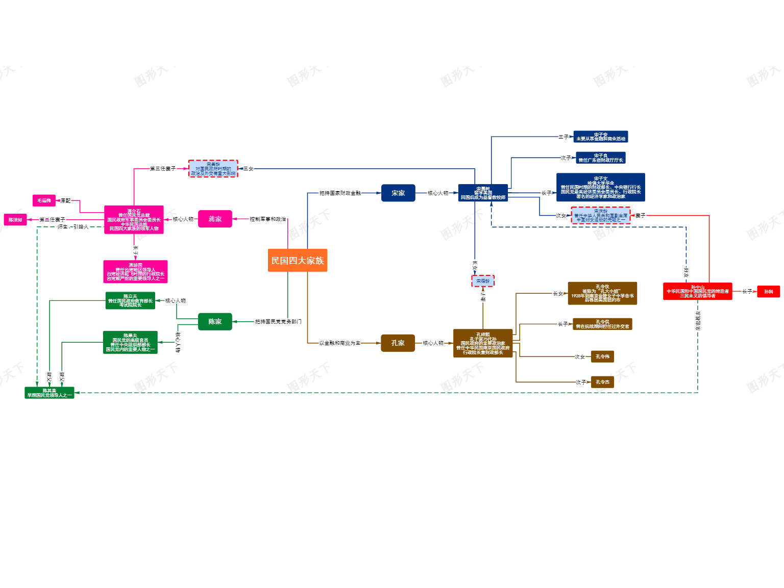 关系图展示了民国时期四个极具影响力的家族——蒋家、宋家、孔家和陈家——之间的错综复杂联系。这些家族分别在不同的领域占据主导地位,共同构成了当时中国政治、经济和社会的核心力量。