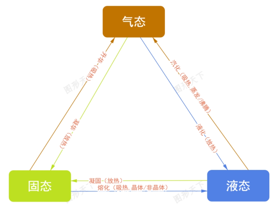摘要:在这个由图形天下呈现的关系图中,通过关系数据可视化的方式展示了物质在气态、液态和固态之间的转换过程。这些状态变化不仅直观地展现了物质在不同条件下的物理转变,而且还揭示了伴随这些转变的能量交换。从气态到液态的液化过程以及从液态到固态的凝固过程均释放热量;而从固态到气态的升华过程和从液态到气态的汽化过程则需要吸收热量。这些可视化的关系数据帮助我们更好地理解和记忆物质状态变化的基本原理。