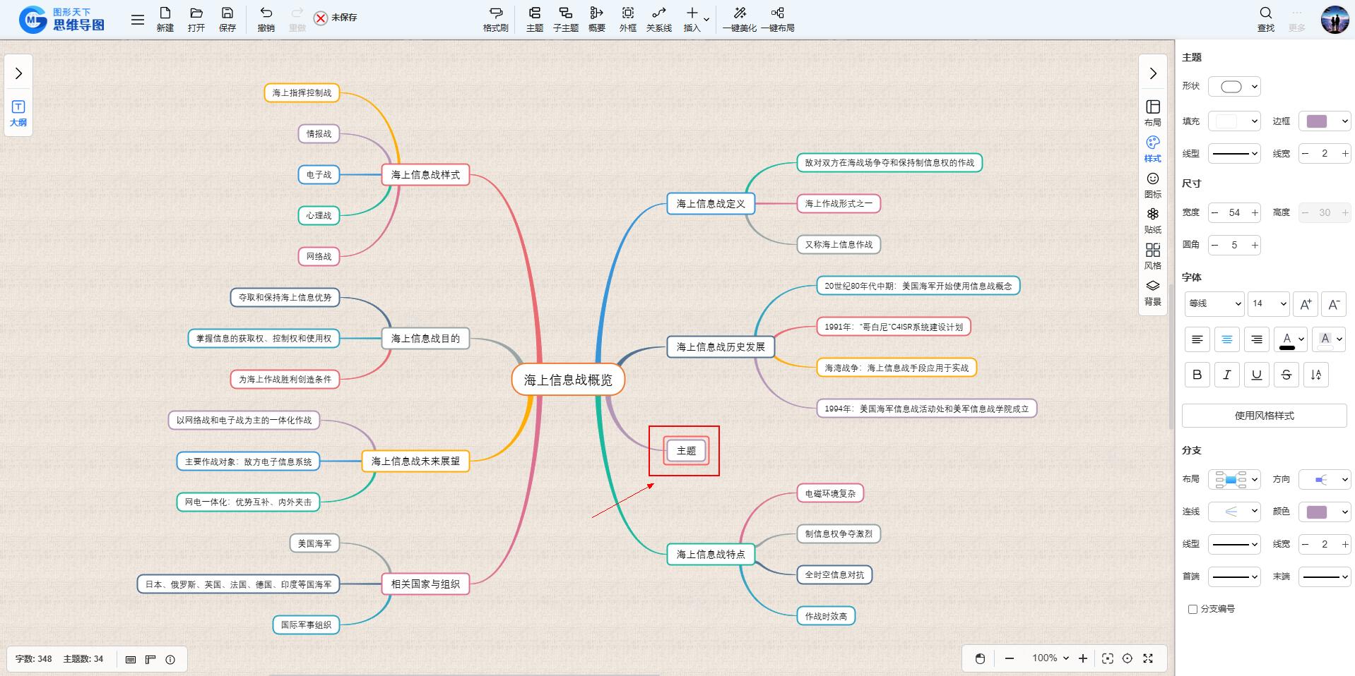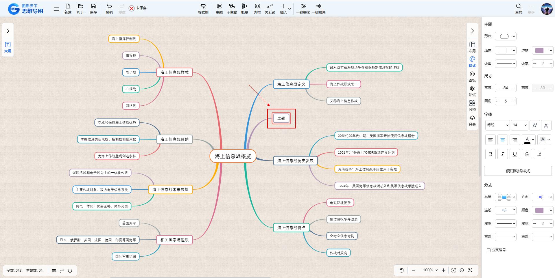 选中当前主题后,点击工具栏上的“主题”按钮,就能在当前主题旁边添加一个同级的新主题。
