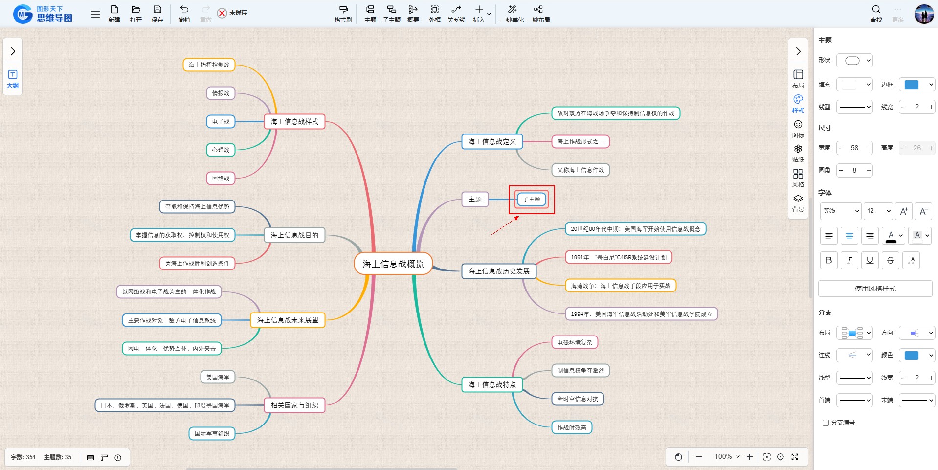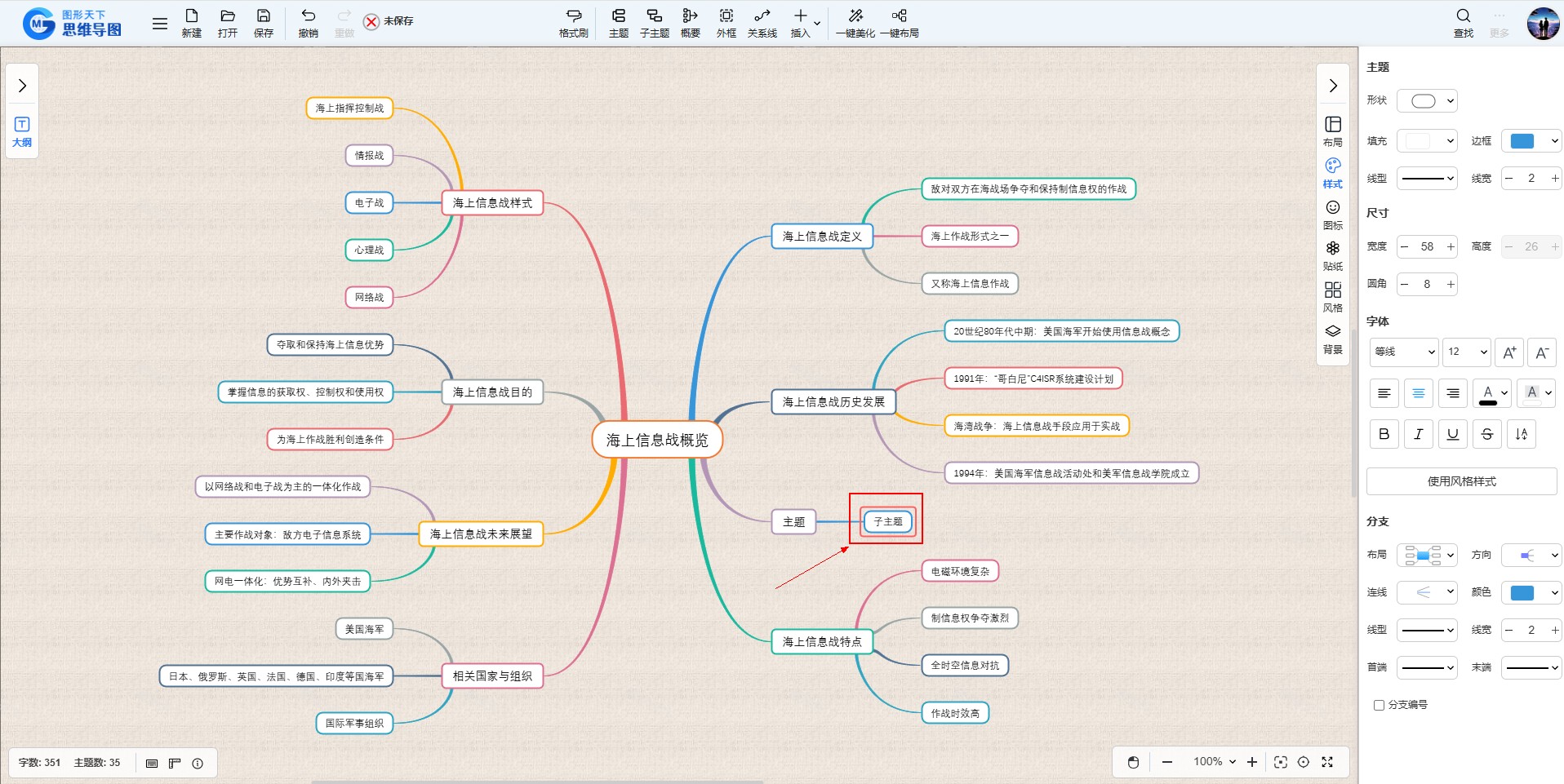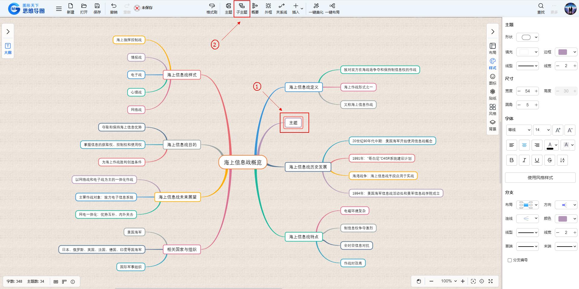 若需添加子主题,则点击工具栏上的“子主题”按钮。