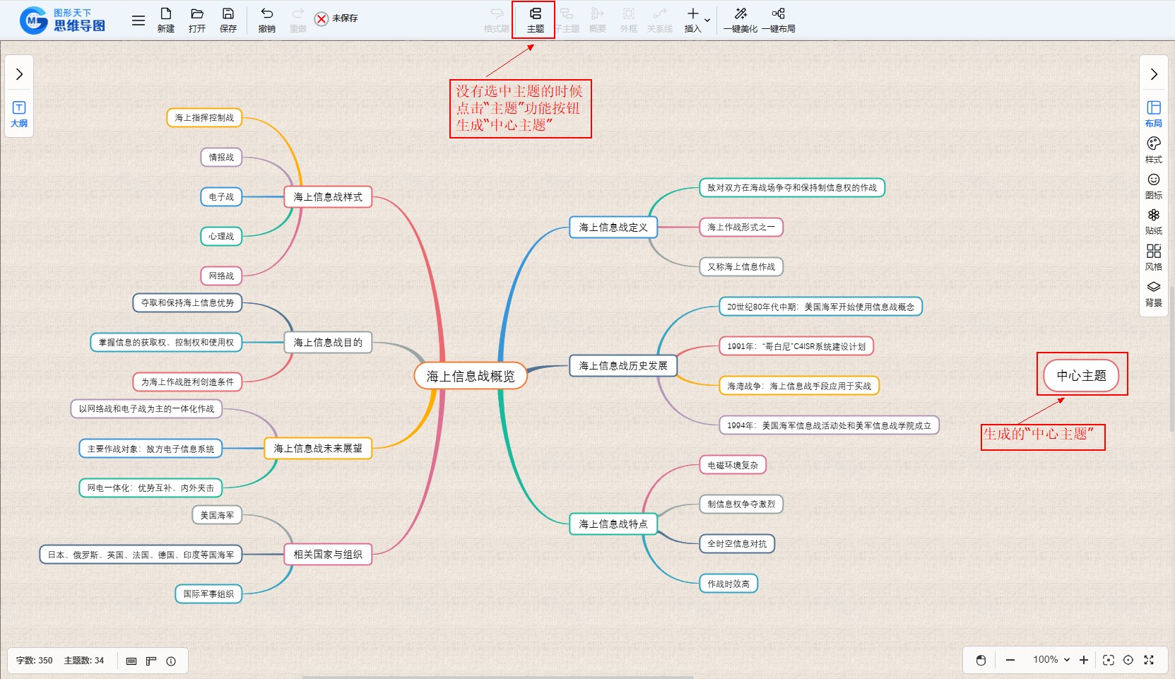 如果您没有选中任何主题,点击工具栏上的“主题”按钮时,则可以在图中鼠标点击的位置再增加一个中心主题。