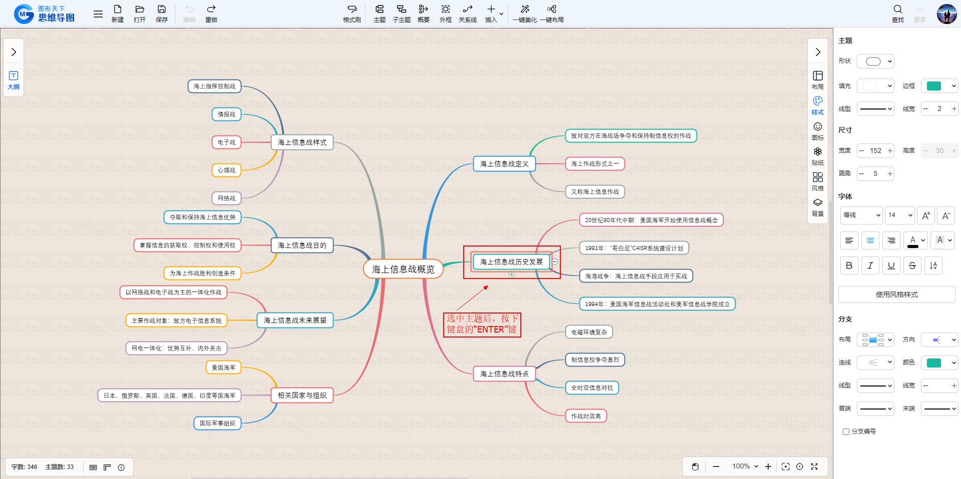 同样地,选中想要添加的主题后,按下“Enter”键可轻松生成一个同级主题;