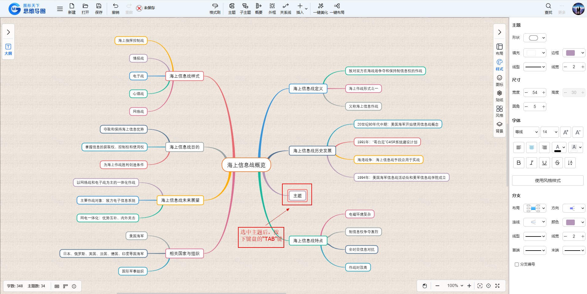 若要添加子主题,按下“Tab”键则可生成一个子主题。