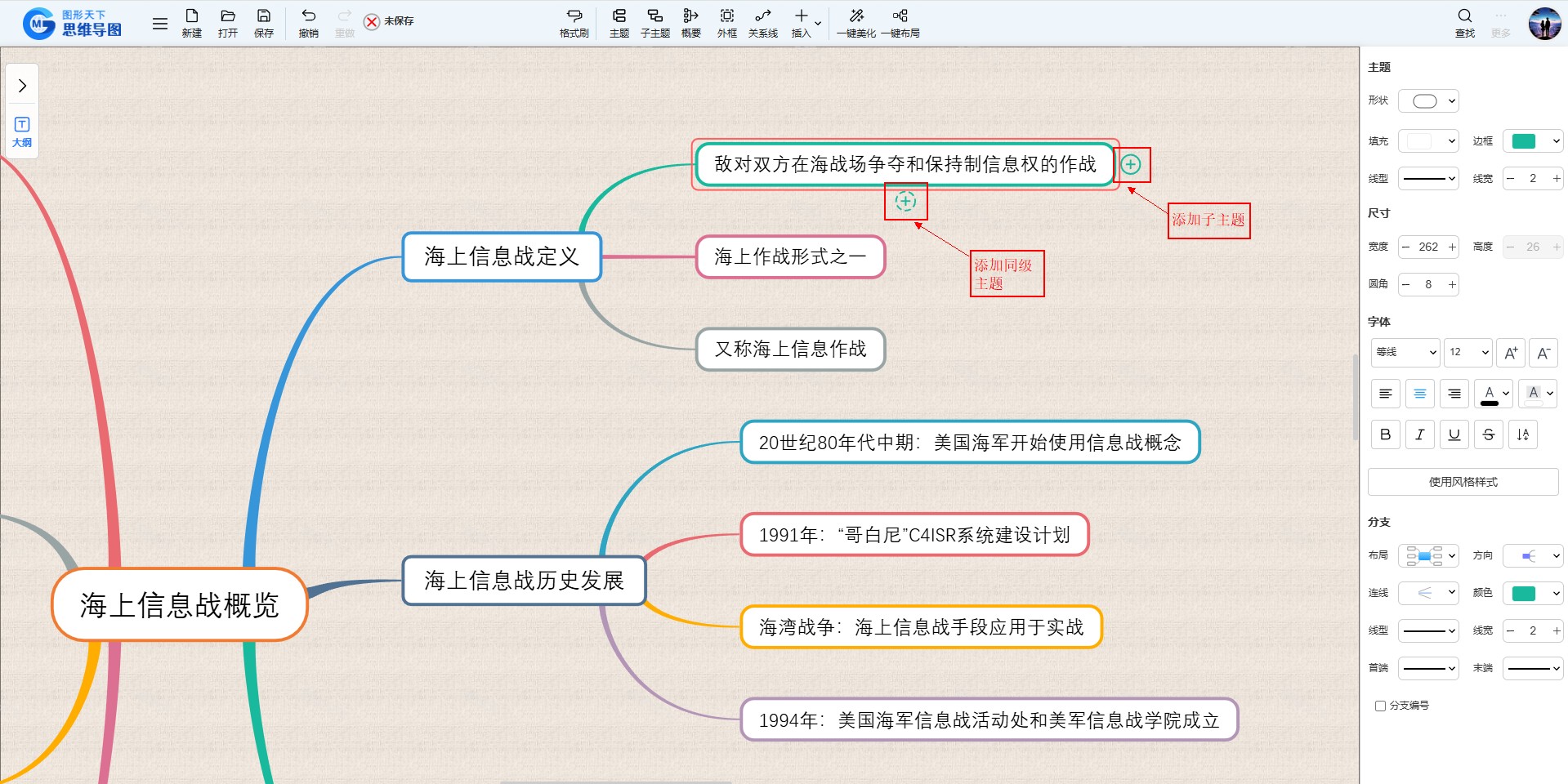 点击主题旁临近同级主题的“+”号,添加同级主题;点击主题旁空白处的“+”号,添加子主题。