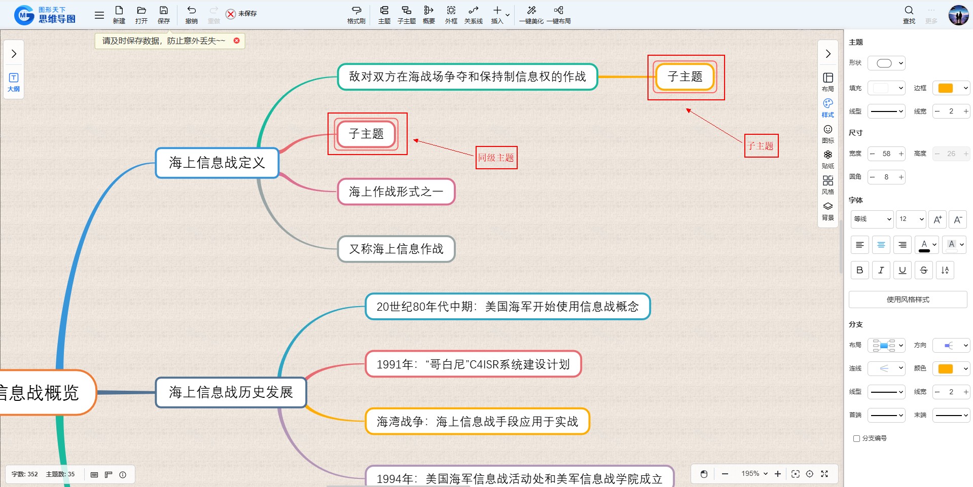 子主题:子主题是主题的进一步细分,代表与主题相关的更具体、更细节的概念或信息。在主题的分支上,子主题以次级分支的形式出现。子主题帮助进一步细化主题的内容,提供额外的信息或解释,使思维导图更加详细和完整。子主题可以有多级,即一个子主题下还可以有更低级别的子主题,形成层级结构。