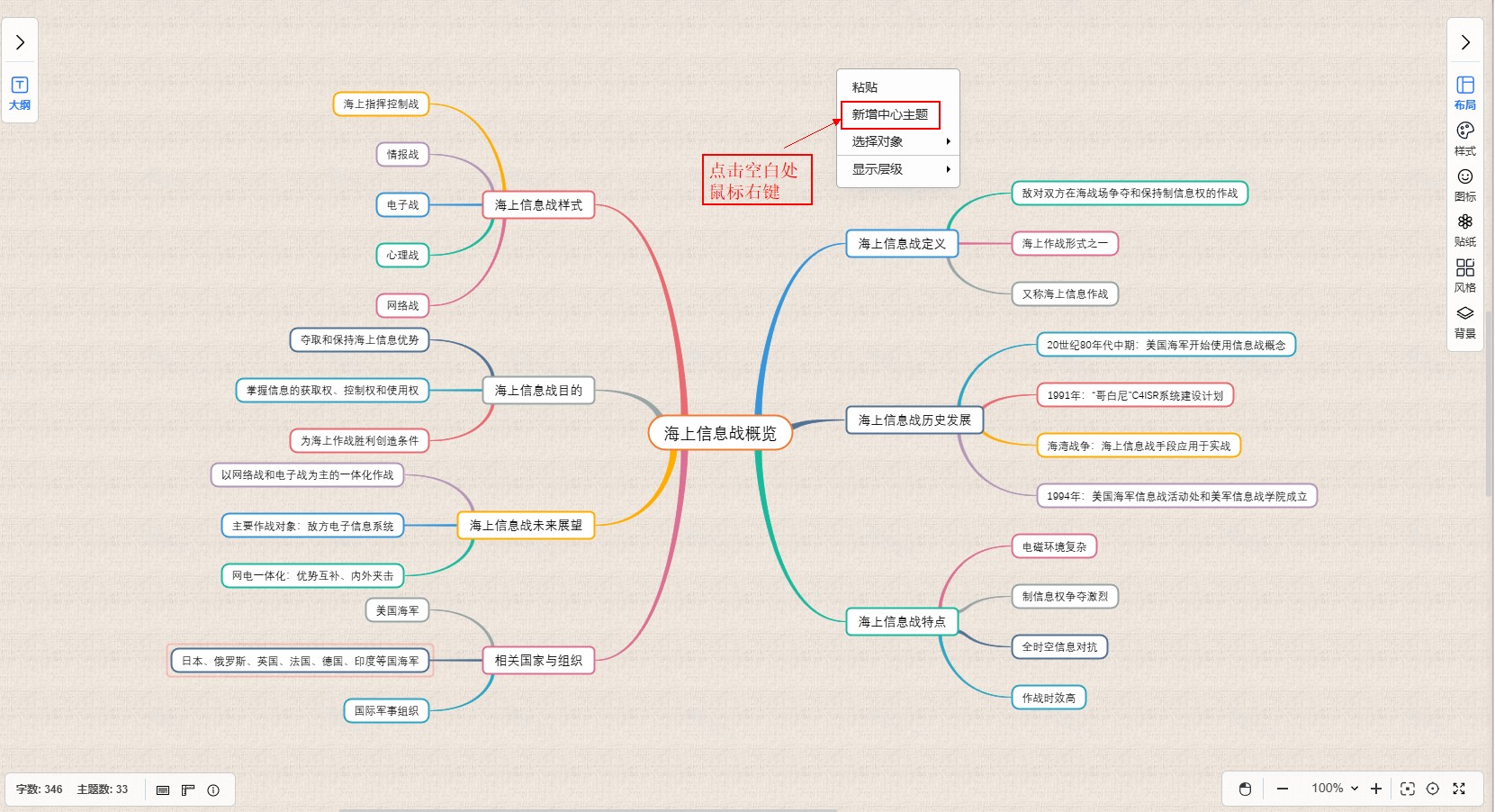 在空白处点击右键菜单,通过“添加中心主题”功能,可以在鼠标位置增加一个新的中心主题。