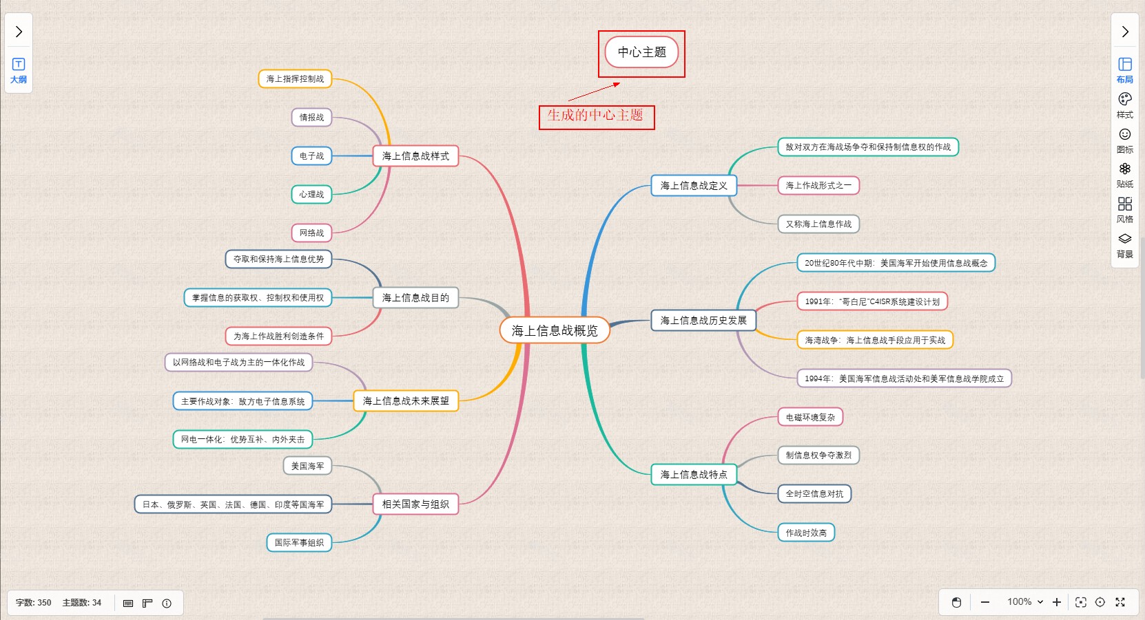 中心主题:中心主题是思维导图的起点和核心,代表了整个思维导图的主题或中心思想,通常位于思维导图的中心位置,是整个图形的焦点。它引导思维导图的扩展方向,并作为所有其他主题和子主题的起点。