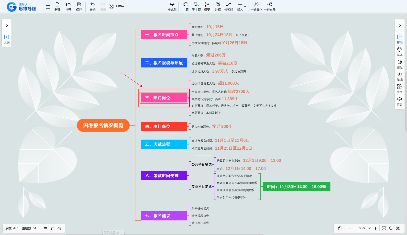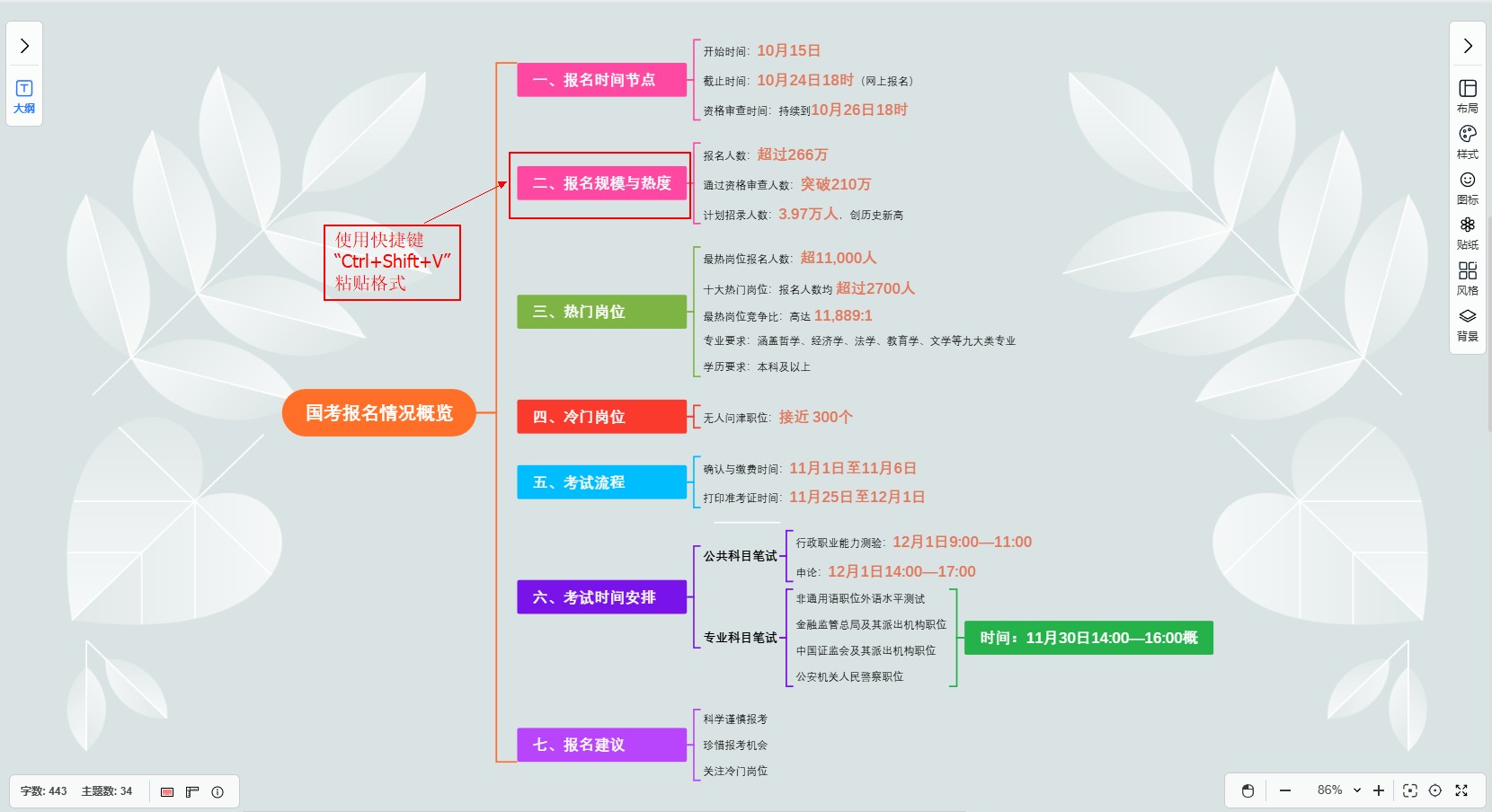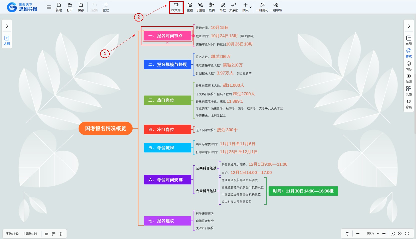 格式刷是一种在图形天下思维导图中用于快速复制和应用选定对象(如主题、概要、外框、关系线等)的格式(包括形状、填充色、边框色、字体、字号等样式)到其他对象上的工具。它能够帮助用户统一和美化思维导图的外观,提高工作效率。