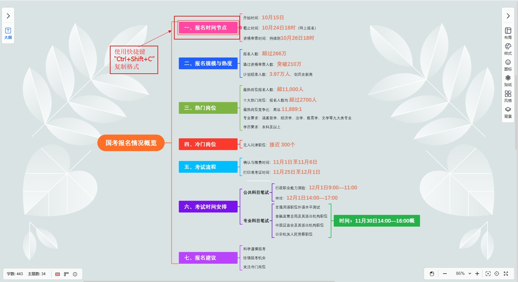 首先,在思维导图中选择一个已经设置好格式的对象作为源对象。然后使用组合键“Ctrl+Shift+C”激活格式刷功能。