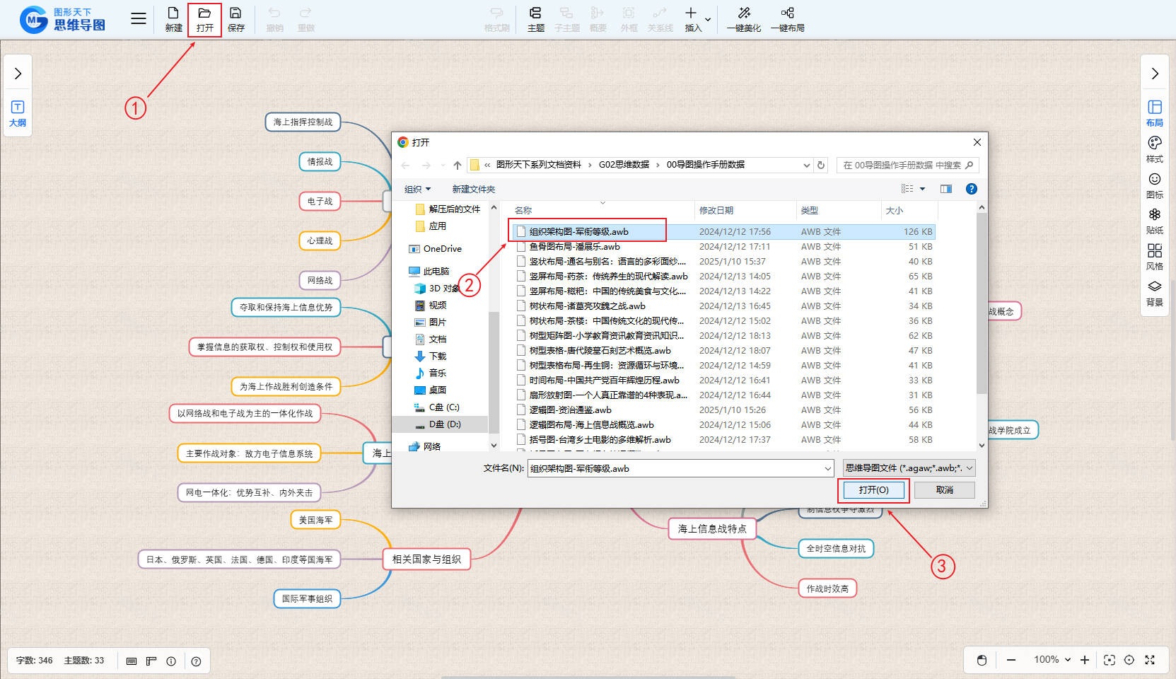 打开文件是指在图形天下思维导图软件中,通过工具栏的“打开”功能将之前保存或创建的思维导图文件载入当前工作界面的过程。这一操作允许用户继续编辑、查看或分享之前的工作成果。
